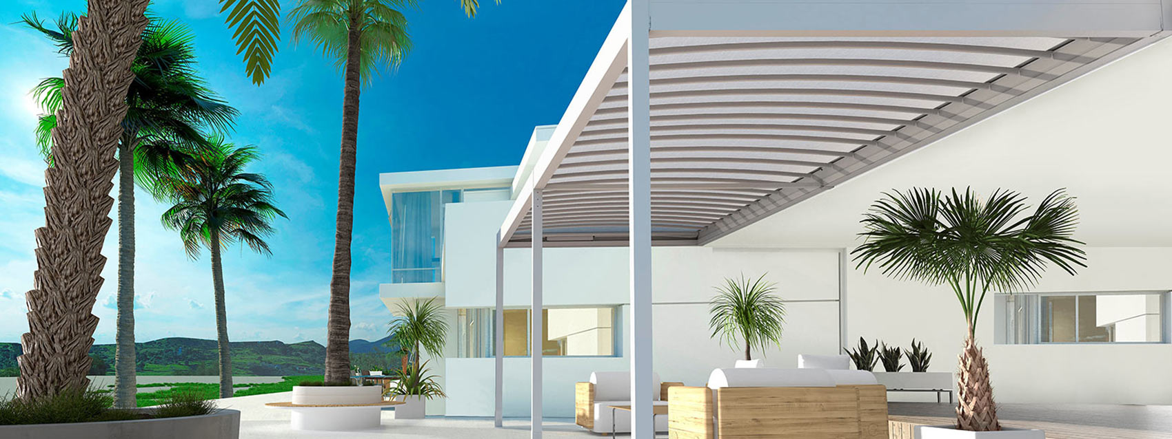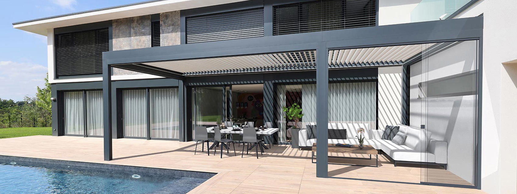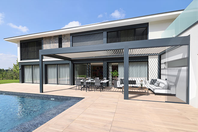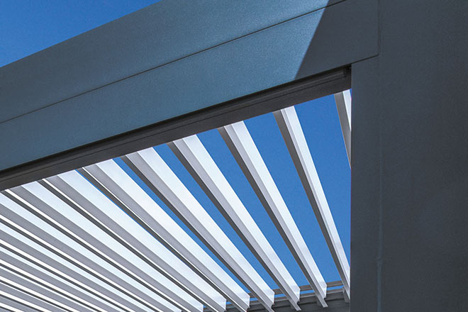 Die bioklimatischen Lamellen lassen sich bequem per Fernbedienung steuern und ermöglichen eine ideale Luftzirkulation. Die Lamellen lassen sich bis zu 175 Grad schwenken und besonders leise öffnen und schließen. Sollte die Fernbedienung mal nicht greifbar sein, sorgt die optionale Sonnen- und Windautomatik oder der Regensensor dafür, dass Sie und Ihre Outdoor-Möbel jederzeit geschützt sind.